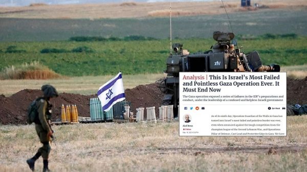 স্বদেশ ডেস্ক: গাজায় ফিলিস্তিনি যোদ্ধাদের বিরুদ্ধে ইসরায়েলের সব পরিকল্পনাই ব্যর্থ হয়েছে বলে মন্তব্য করেছে ইসরায়েলি সংবাদপত্র হারেৎজ। পত্রিকাটির প্রধান সম্পাদক আলুফ বেন এক বিশ্লেষণে বলেন, এই যুদ্ধ এখনই বন্ধ করতে